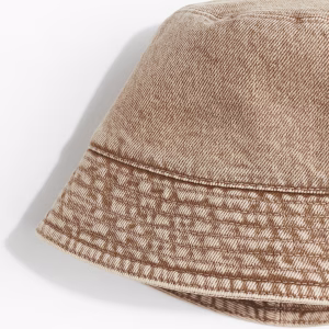 Mũ che nắng bằng cotton dệt thoi có hình in toàn bộ, vành mũ dốc, dài hơn ở phía sau và có dây buộc dưới cằm. Có lớp lót.