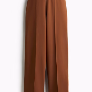 Quần dài bằng vải nhăn, mỏng nhẹ dệt thoi làm từ viscose pha. Cạp co giãn có dây buộc trang trí hai bên, túi chéo phía trước và ống suông.